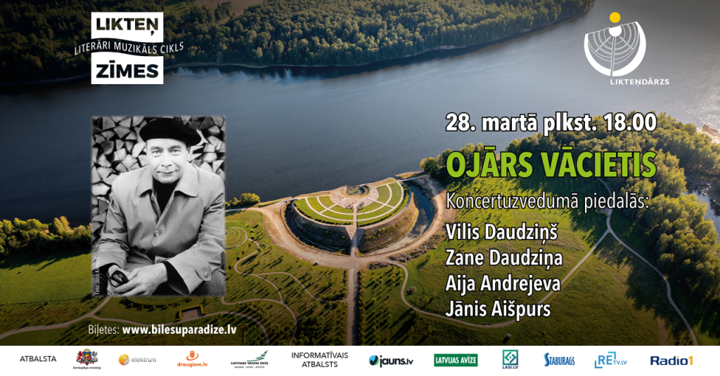 Ciklu atklās koncertuzvedums “Likteņzīmes. Ojārs Vācietis” (28. martā plkst. 18.00). Vakars būs veltīts vienam no nozīmīgākajiem 20. gadsimta latviešu dzejniekiem, kura darbi skanēs gan dzejā, gan dziesmās. Pasākumā piedalīsies Vilis Daudziņš, Zane Daudziņa, Aija Andrejeva un Jānis Aišpurs. Būs dzirdama arī Ludmilas Azarovas dzeja, un viesosies Ojāra Vācieša muzeja direktore Ieva Ķīse.